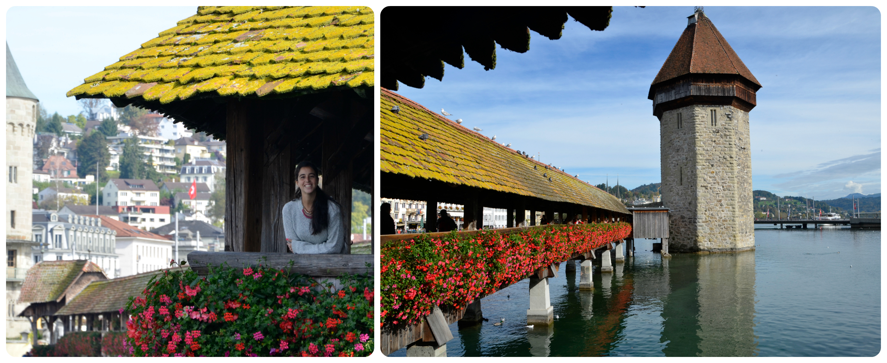 Camino a nuestra próxima parada, pasamos por Lucerna, que la cruza el río Reuss, por lo que tiene muchos puentes que la cruzan y uno de ellos es muy famoso, el Chapel Bridge: es peatonal y hecho de madera, está decorado con flores y por dentro se puede ver en dibujos la historia de la ciudad. Era el puente techado más antiguo de Europa, pero tuvo que ser reconstruido después de un incendio en 1993.