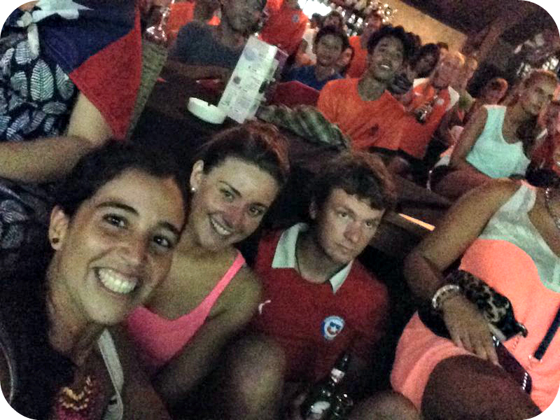 Al día siguiente decidimos quedarnos en la isla y no hacer ningún paseo, estuvo demasiado rico, y almorzamos en el mismo lugar de los cojines. Ese era el día del partido con Brasil así que teníamos que averiguar dónde iban a estar los chilenos viéndolo. Fue fácil, salimos a comer y habían dos hombres caminando en la calle: uno con la polera de la U y el otro con la polera del Colo, así que un “Hola como estai” y ya éramos amigos jajajaja partimos a comer juntos, los dos eran de Chiloe y estaban recorriendo Asia después de haber estudiado o trabajado en Australia. Cachen en mundo chico, no se porque empezamos a hablar de la Patagonia y yo dije que tenía una amiga en Coyhaique y Julián (el de la U) cuenta que tiene una amiga con la que hizo el curso Nols y que decidió quedarse a vivir en Coyhaique después… era mucha coincidencia que dos personas hicieran lo mismo así que le pregunté el nombre de su amiga y era la Jose Ruiz!!! En verdad muy divertido. Bueno al final el partido lo vimos en el bar de nuestro hotel, el ambiente era demasiado animado, la mitad brasileños y la otra mitad chilenos, pantalla gigante y gritos todo el rato. Para que decirles lo que fue verlo, en verdad la cara de los brasileños a medida que avanzaba el partido se fue transformando drásticamente, en cambio nosotros nunca perdimos la esperanza hasta el final.
