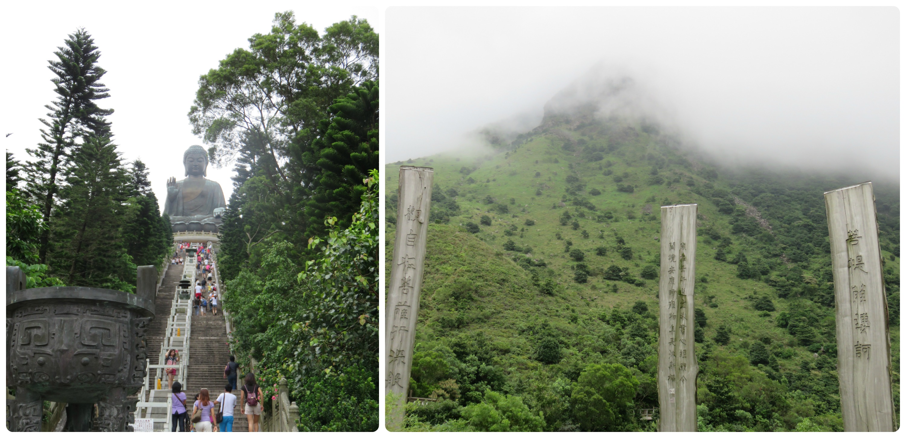 El lunes era el día de la visa, fui a hacer los trámites y en 5 minutos estaba lista, tenía que ir a buscar mi pasaporte el miércoles. Lo importante de este día es que me desperté y decidí que no quería estar más en ese cuchitril, ni idea si el aire acondicionado se echó a perder o alguien lo apagó, pero esa minipieza (les juro que era más chica que la sala de clases del colegio!) con 10 personas adentro (y sus olores!!) y las cucarachas dando vuelta era mucho, así que partí a un hostal más caro pero con buenísimas referencias, la mejor decisión jajaja. El ambiente demasiado entretenido (Urban Pack Hostel, por si alguno va a HK), limpio, la gente de ahí muy amigable (en vez del chino del otro hostal que te gritaba por lo que sea). Apenas llegué con mi bolso conocí a un gringo que iba a ir al Big Buda (sii!! Mas Budas gigantes!), así que me uní a su paseo. Estuvo entrete, además hicimos un mini mini trekking, más bien una caminata de 20 minutos a los pilares de la sabiduría, el problema es que la “sabiduría” estaba toda escrita en chino, así que ni me enteré, eso si la vista es muy linda.